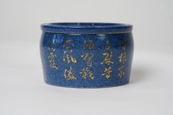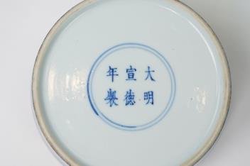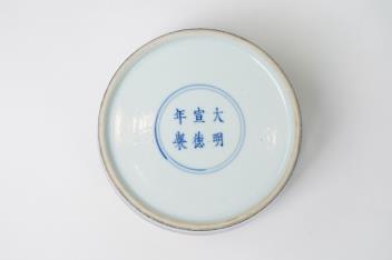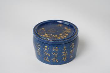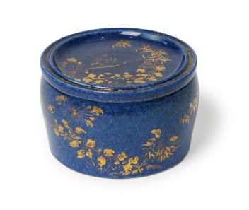 Lot 123 , A Chinese gilt-decorated powder blue ‘fighting cricket’ box and cover, Xuande six character mark but later