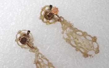 Necklace in good condition (which is particularly rare for these jewels), though partially frayed towards the clasp and would require careful restoration. Brooch and earrings with some deficiencies and repairs. Case lovely and possibly original to set.