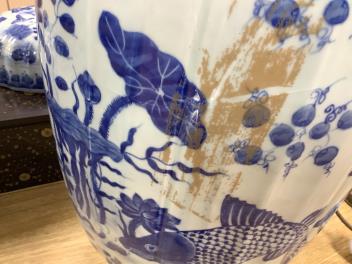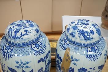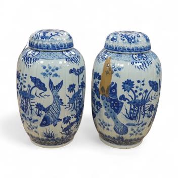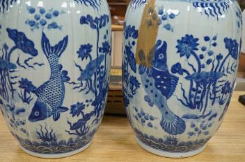 Lot 472 , A large pair of Chinese blue and white ovoid jars and covers decorated with fish and lotus, 48cm high