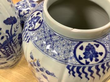 One vase badly bruised, chipped and with cracks running from this bruise, visible inside and out, image 4; this damage extends to the neckrim where there is a chip, image 5. Other vase good; covers good.