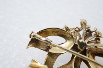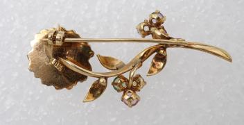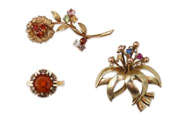 Lot 2943 , Two brooches and a ring, mid 20th century, comprising: a brooch of floral design, set with circular-cut synthetic gemstones, length 3.7cm, Austrian assay marks for gold, gross weight approximately 6.5 grams; a brooch des