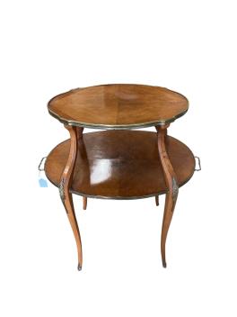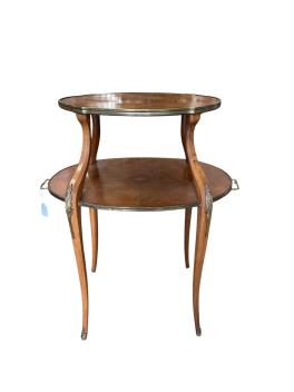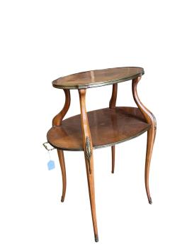 Lot 121 , A gilt metal mounted oval mahogany two tier etagere, width 72cm, depth 46cm, height 88cm.