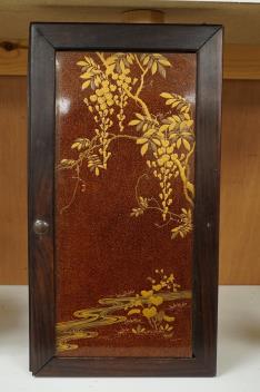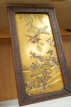 Lot 1408 , A Japanese gold lacquer panel inlaid with a bone stork and flowers (some losses), framed, 34cm high