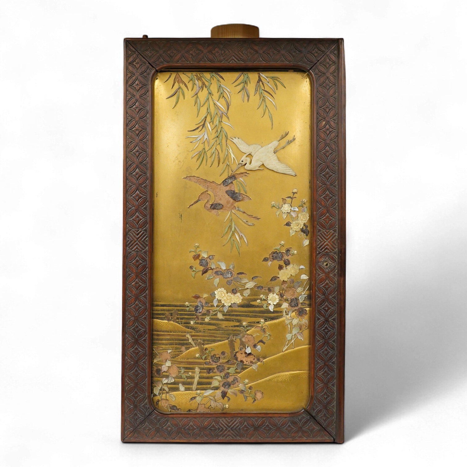 A Japanese gold lacquer panel inlaid with a bone stork and flowers (some losses), framed, 34cm high