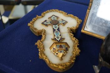 Lot 533 , A Blue John egg, on white metal stand, an ormolu and alabaster candlestick cast as frogs, 18cm high, a French champleve, ormolu and alabaster holy water stoup and a gilt brass easel-back photograph frame