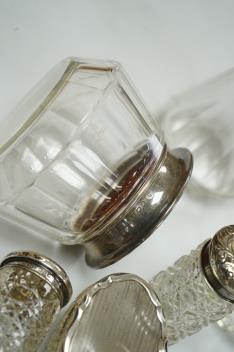 Lot 1835 , Three George V silver and tortoiseshell mounted glass toilet jars, Adie Brothers, Birmingham, 1925 & 1927, together with three other silver mounted glass toilet jars.