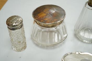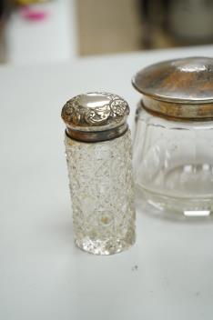 Three George V silver and tortoiseshell mounted glass toilet jars, Adie Brothers, Birmingham, 1925 & 1927, together with three other silver mounted glass toilet jars.