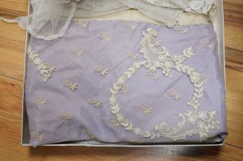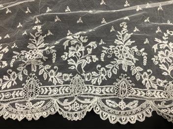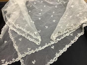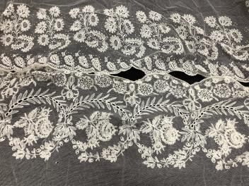 Brussels veil 140cm x 132cm. Condition - the two needle run veils have damage on the net, the coverlet the lace is very damaged, but elements are still good to cut up and reuse. A useful lot for wedding dress designers.