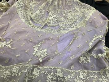 Lot 335 , A small late 19th century Brussels wedding veil, an earlier Brussels bobbin bonnet veil, two needle run bonnet veils, various lace sleeves and a lilac silk and lace coverlet., Brussels veil 140cm x 132cm. Condition - the