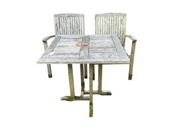 A Lindsey weathered teak square garden table, width 79cm, height 73cm and two chairs