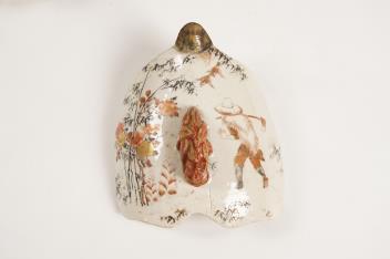 An unusual Japanese Kutani shell shaped vessel, 19th century, the cover painted with a farmer and modelled with a bamboo shoot handle, signed ‘kutani’ to one side, 27cm cross, minor faults
