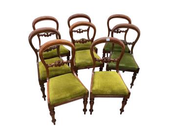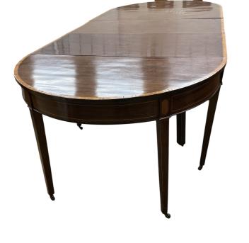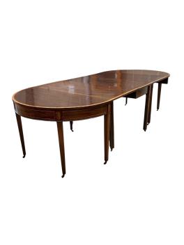 Lot 1027 , A George III satinwood banded mahogany D end extending dining table, with two spare leaves, 284cm extended, depth 120cm, height 74cm, together with a set of eight Victorian mahogany balloon back dining chairs