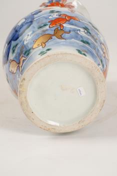 A Japanese Imari ewer and basin, late 19th century, each painted with Koi carp in a pond surrounded by rockwork and flowers, ewer 36cm high, basin 44.5 cm diameter, basin restored