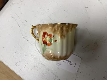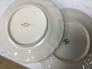 Two circular serving plates. Twelve side plates. Eleven cups - one with two minor chips at neckrim; 9th image; one handle repaired, 10th image. Twelve saucers. Light surface wear and occasional knife-cut.