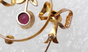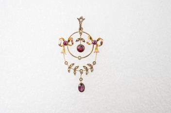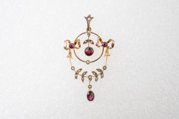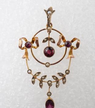 Lot 2927 , An Edwardian garnet and seed pearl pendant, early 20th century, of foliate design with ribbon bow motifs, set with circular-cut and oval garnets and seed pearls, mounted in gold, length 5.2cm, stamped 9CT, gross weight a