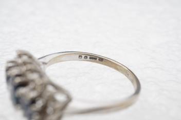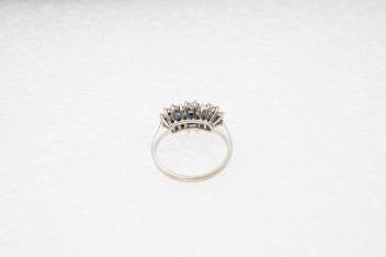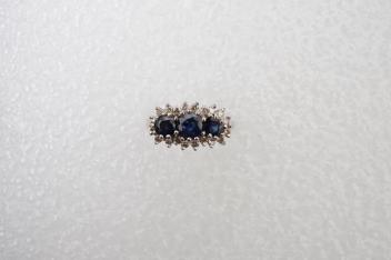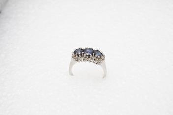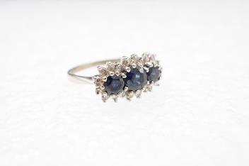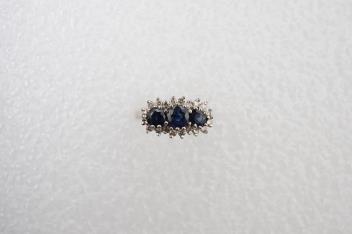 Lot 2959 , A sapphire and diamond ring, set with three circular-cut and oval sapphires, within a border of brilliant-cut diamonds totalling approximately 0.40 carats, mounted in 18ct white gold, size M1/2, British hallmarks, gross
