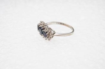 A sapphire and diamond ring, set with three circular-cut and oval sapphires, within a border of brilliant-cut diamonds totalling approximately 0.40 carats, mounted in 18ct white gold, size M1/2, British hallmarks, gross weight approximately 4 grams