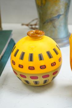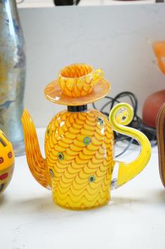 Lot 1578 , A contemporary glass Kama teapot sculpture - 22cm high and two studio glass vases, one indistinctly signed