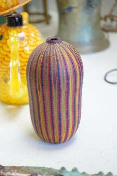 A contemporary glass Kama teapot sculpture - 22cm high and two studio glass vases, one indistinctly signed,