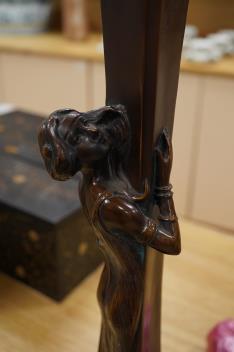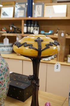 Lot 473 , In the manner of Gustav Gurschner, an Art Nouveau style figural bronze lamp with yellow etched shade, 58cm