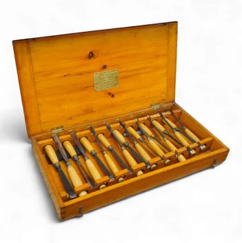An 18-piece Marples wood carving chisel set, contained within the original fitted pine case with original Marples label to the inside of the lid