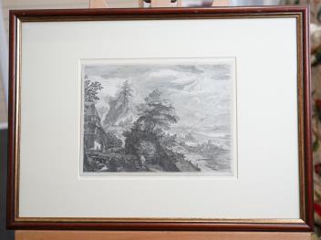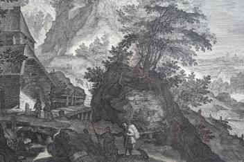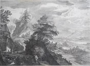 Lot 125 , After Aegidius Sadeler the Elder, Flemish 1570–1629, 'River Landscape with Farmhouse and Pilgrims'