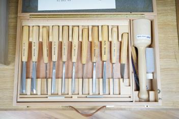 Lot 2275 , A Swiss made Pfeil 25-piece wood carving set, comprising; carving chisels, a mallet, sharpening stones, etc. contained within a fitted beech case, 530 x 330 x 95mm