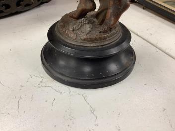 Spelter finish generally worn/rubbed/lightly corroded; redundant hole at the dead game she holds, image 5; ebonised plinth spotted, image 6.