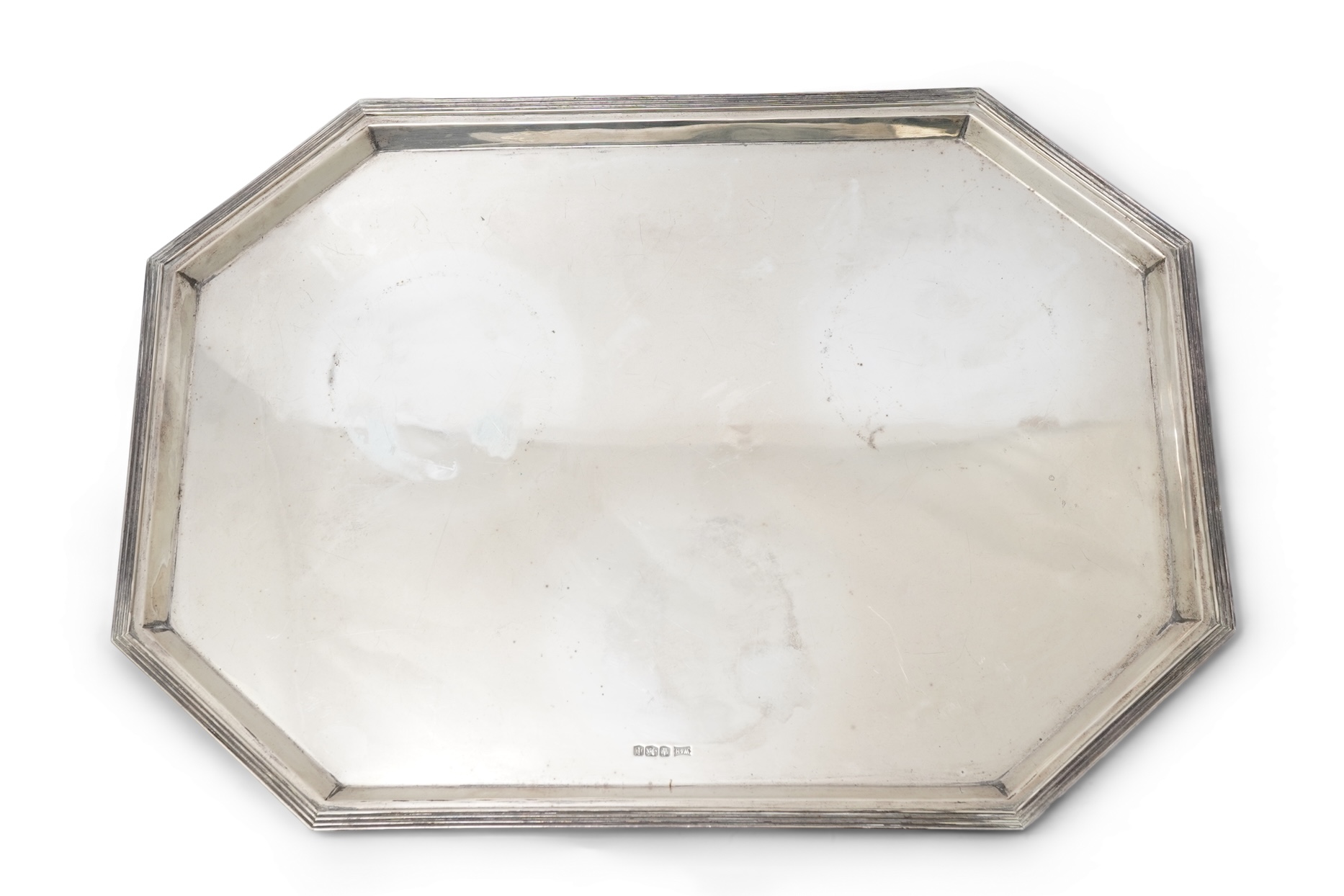 A George V silver octagonal tea tray, by Walker & Hall, with reeded border, Sheffield, 1926, length 46.3cm, 59.7oz.