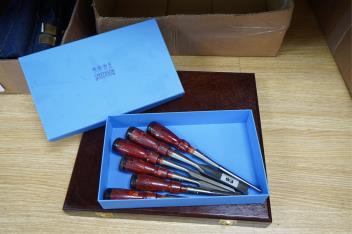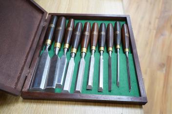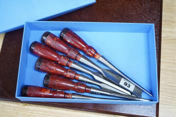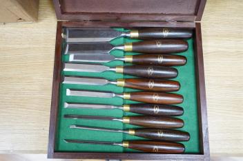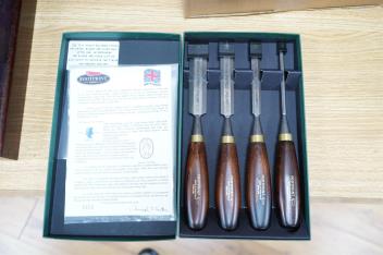 Lot 2265 , Three sets of cabinet makers bevel edge chisels; a 10-chisel set by Crown Tools, Sheffield, in a wooden case, a Footprint Tools limited edition for chisel set with hardwood handles, and an unboxed set of five wood handle
