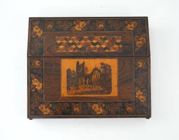 A Tunbridge ware rosewood writing slope, mid 19th century, the sloping fall decorated with a micromosaic view of Bayham Abbey ruins, within perspective cube marquetry and floral mosaic bands, the interior enclosing a pair of glass inkwells with mosaic lids, 31cm wide