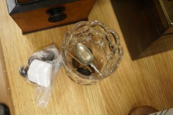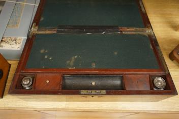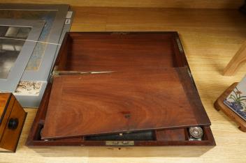 A bird’s-eye maple tea caddy and a brass mounted writing slope, latter 50cm wide