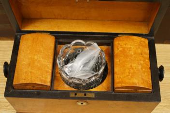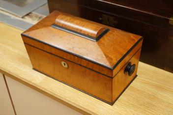 Lot 496 , A bird’s-eye maple tea caddy and a brass mounted writing slope, latter 50cm wide