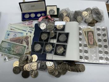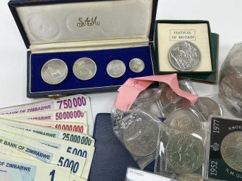 A large collection of Rhodesia, British and World coins and banknotes, highlights include Rhodesia proof four coin set, 1964, an album of Rhodesia banknotes, 1979, an album of Victoria to Elizabeth II coins, including some pre-1947 sixpences and threepences, pennies, half pennies and farthings etc, George VI, Festival of Britain crown, 1951, a large quantity of Elizabeth II, cupronickel commemorative crowns, a quantity of worn Victorian pennies, foreign circulated coinage, other banknotes, etc