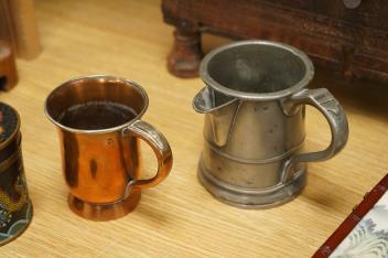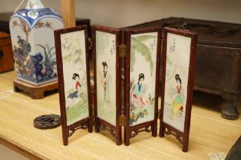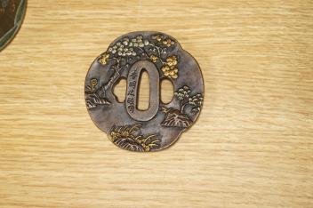 A Chinese cloisonné enamel ‘dragon’ jar and cover, a Chinese miniature four-fold table screen, two metalware tankards and a reproduction Japanese tsuba, cloisonne jar 9cm