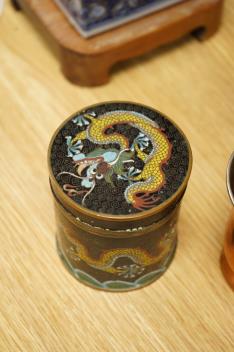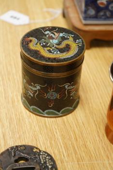 Lot 494 , A Chinese cloisonné enamel ‘dragon’ jar and cover, a Chinese miniature four-fold table screen, two metalware tankards and a reproduction Japanese tsuba, cloisonne jar 9cm