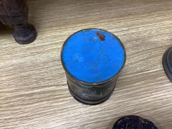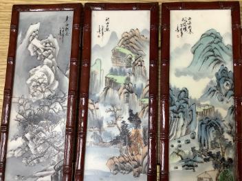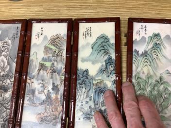 Cloisonne jar slight dent to neckrim without damaging enamel; chipped blue enamel at interior base and underside, 8th and 9th images. Three of the four porcelain panels damaged, image 10; one hinge incomplete, image 11. Pewter jug dented.