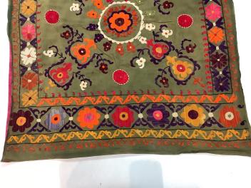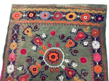 Lot 374 , A late 19th early 20th century Suzani table cover. Worked on an olive green cotton in bright polychrome silk threads. Probably from Uzbekistan, made as part of a brides dowry with later lining., 88cm x 98cm. Condition -