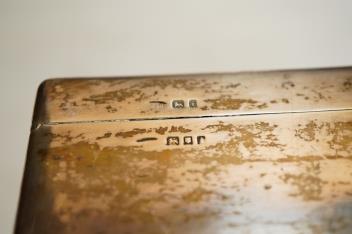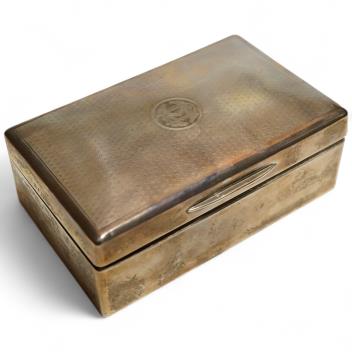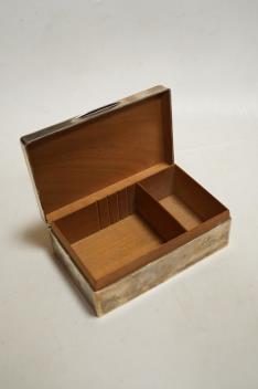 Lot 1847 , A George V silver table cigarette box with engine turned lid, London, 1924, makers mark rubbed, cedar lined with division, initialled length 14cm.