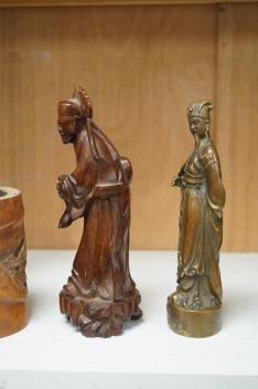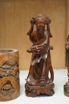 A bronzed Chinese figure of Qianlong, a carved bamboo brush pot and a hardwood figure, largest 20cm high