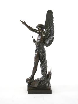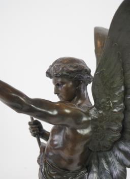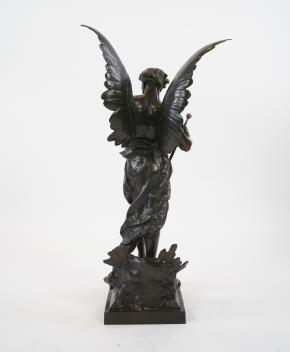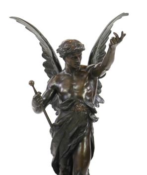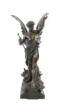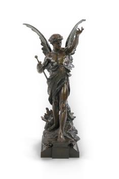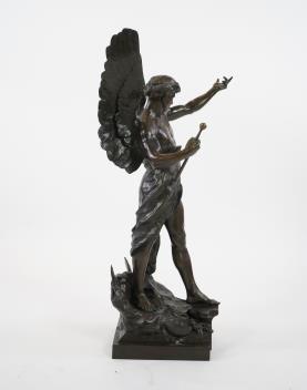 Émile Louis Picault (1833-1915). The Genius Of Work. A large bronze figure, modelled as young winged man holding a sceptre, an open book with geometrical patterns lies at his feet, the base inscribed “Sur le champ du labeur la victoire est féconde” (meaning: on the field of labour victory is fruitful) inscribed foundry mark ‘Susse Fres. Paris’ signed “E. PICAULT” foundry stamp Susse Frères et Éditeurs in Paris, 95.5cm high