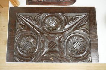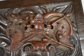 Lot 1444 , Three 18th century and later carved oak panels, one carved with a coronet, largest 46cm wide