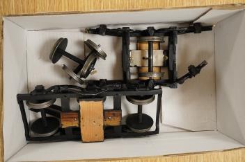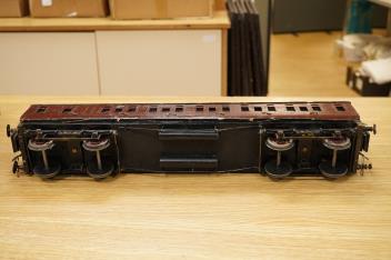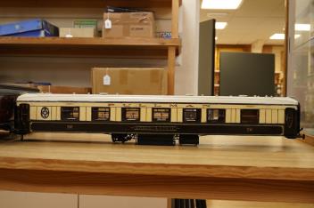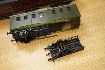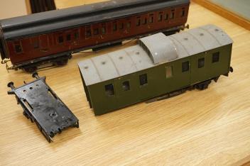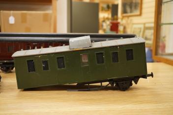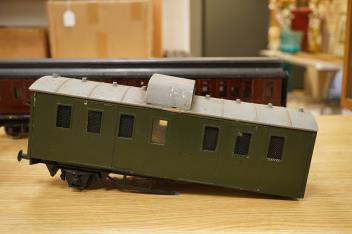 Two Gauge One bogie coaches; a Midland Railway clerestory coach, together with a 12-wheel Pullman car (bogies af), plus an American outline caboose, some scratch building and adaptation from kits, etc.