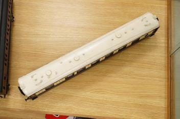 Lot 295 , Two Gauge One bogie coaches; a Midland Railway clerestory coach, together with a 12-wheel Pullman car (bogies af), plus an American outline caboose, some scratch building and adaptation from kits, etc.