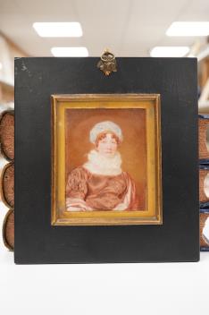 Lot 1676 , Regency School, Portrait miniature of a lady wearing a bonnet, indistinctly inscribed and dated 1822 verso, watercolour on ivory, housed in an ebonised frame, 9.5 x 7.5cm CITES Submission reference EL8U6S7D