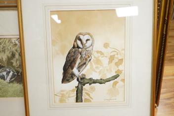 George Hayhurst (b.1954), Study of a barn owl with prey and Two badgers, each signed, one dated 1986, one with Chichester House Gallery label verso, two watercolours, largest 20 x 37cm