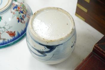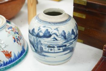 A Chinese famille verte ‘warriors’ bowl and a blue and white ginger jar, bowl 29.5cm diameter