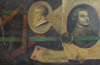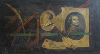 Lot 185 , After Dominique Doncre, 1743-1820, A Trompe l'oeil still life of a medallion bust, portrait and playing card