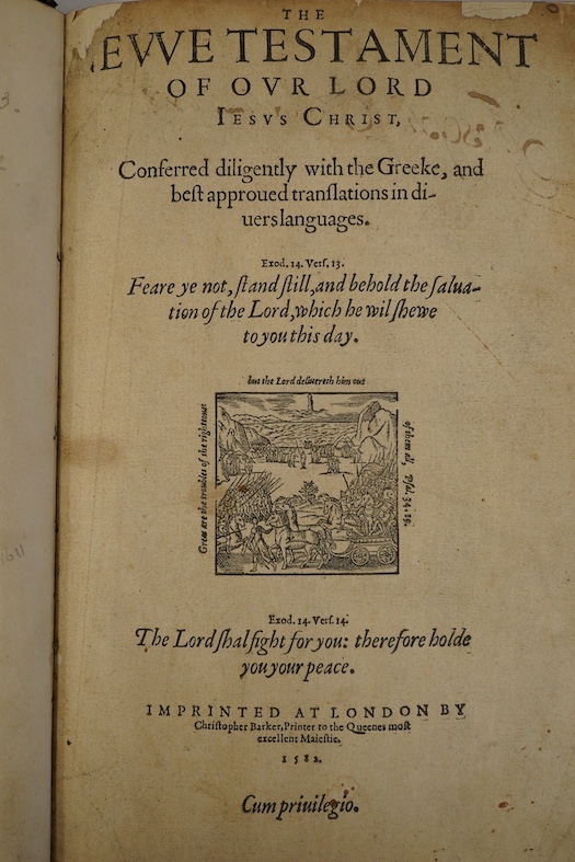 ° Bible. A late 16th century Geneva Bible, but only the New Testament present - The Newe Testament of our Lord Iesu Christ, Conferred diligently with the Greeke, and best approved translations in diuers languages... title with engraved pictorial vignette, pictorial Holy Land Map (gazeteer beneath), printer's engraved device, decorated and historical initial letters; contents - title+prelim. leaf (with map), text, order of yeres (etc). leaf, tables; signatures - (unsigned/ 2), Aaaaa-Vvvvv6, Xxxxx5; foliation - (2), 115+(10); 19th cent.blind ruled black calf, gilt lettered panelled spine, marbled endpapers. folio. Imprinted at London by Christopher Barker...1582. *Herbert 173