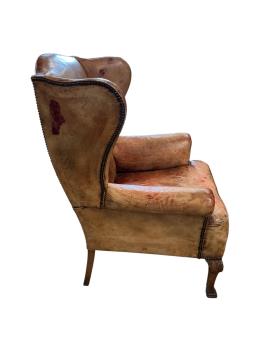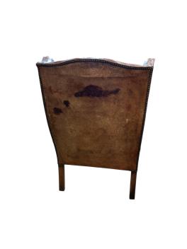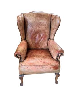 Lot 1016 , A George III style studded pale red leather wing armchair on carved oak cabriole legs, width 74cm, depth 78cm, height 110cm